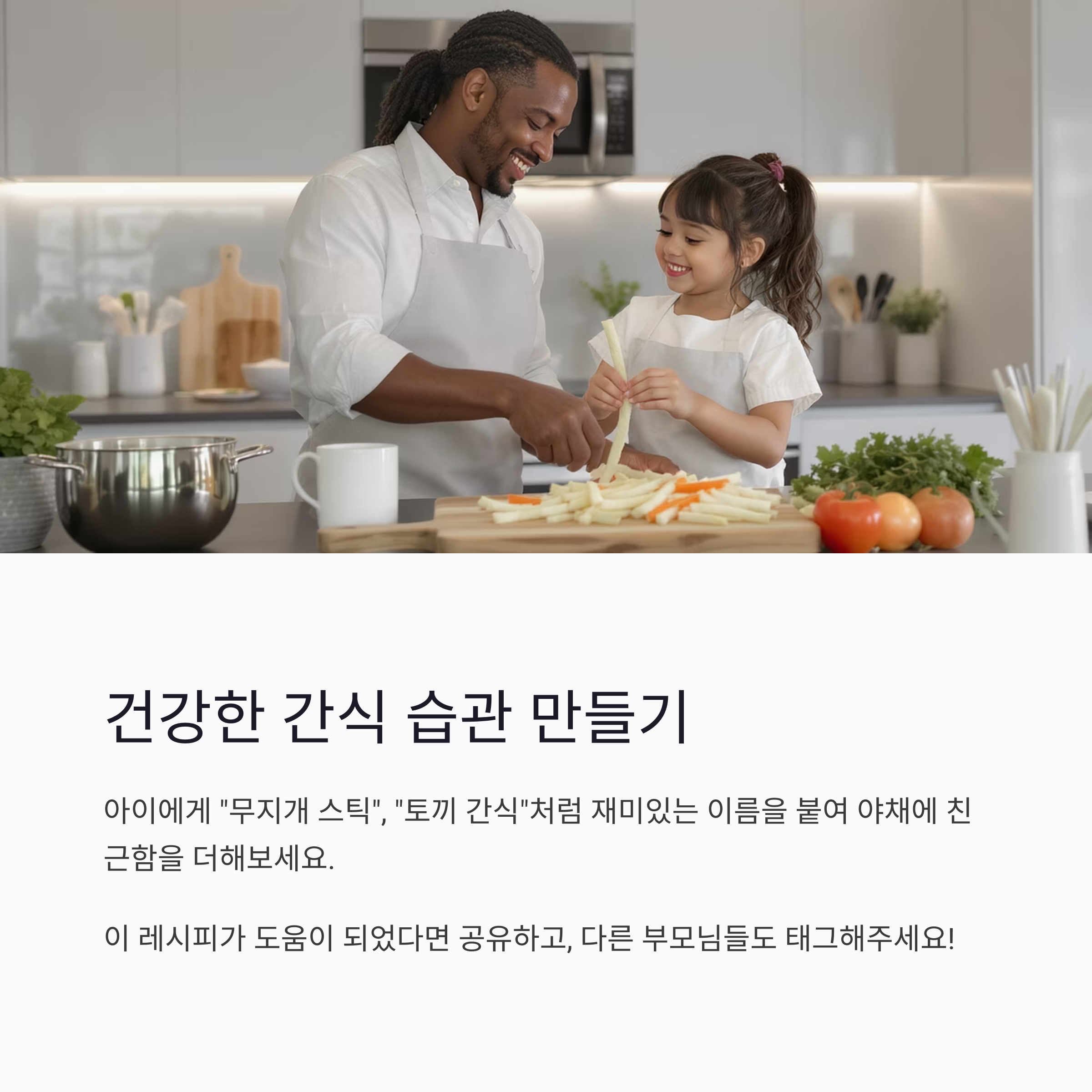 처음엔 거부감을 보일 수 있지만, 색감이 예쁜 접시나 친숙한 이름으로 부르면 아이의 반응이 달라질 수 있습니다. 예: "무지개 스틱", "토끼 간식", "건강 당근 막대기"처럼 재미있는 이름을 붙여주세요.