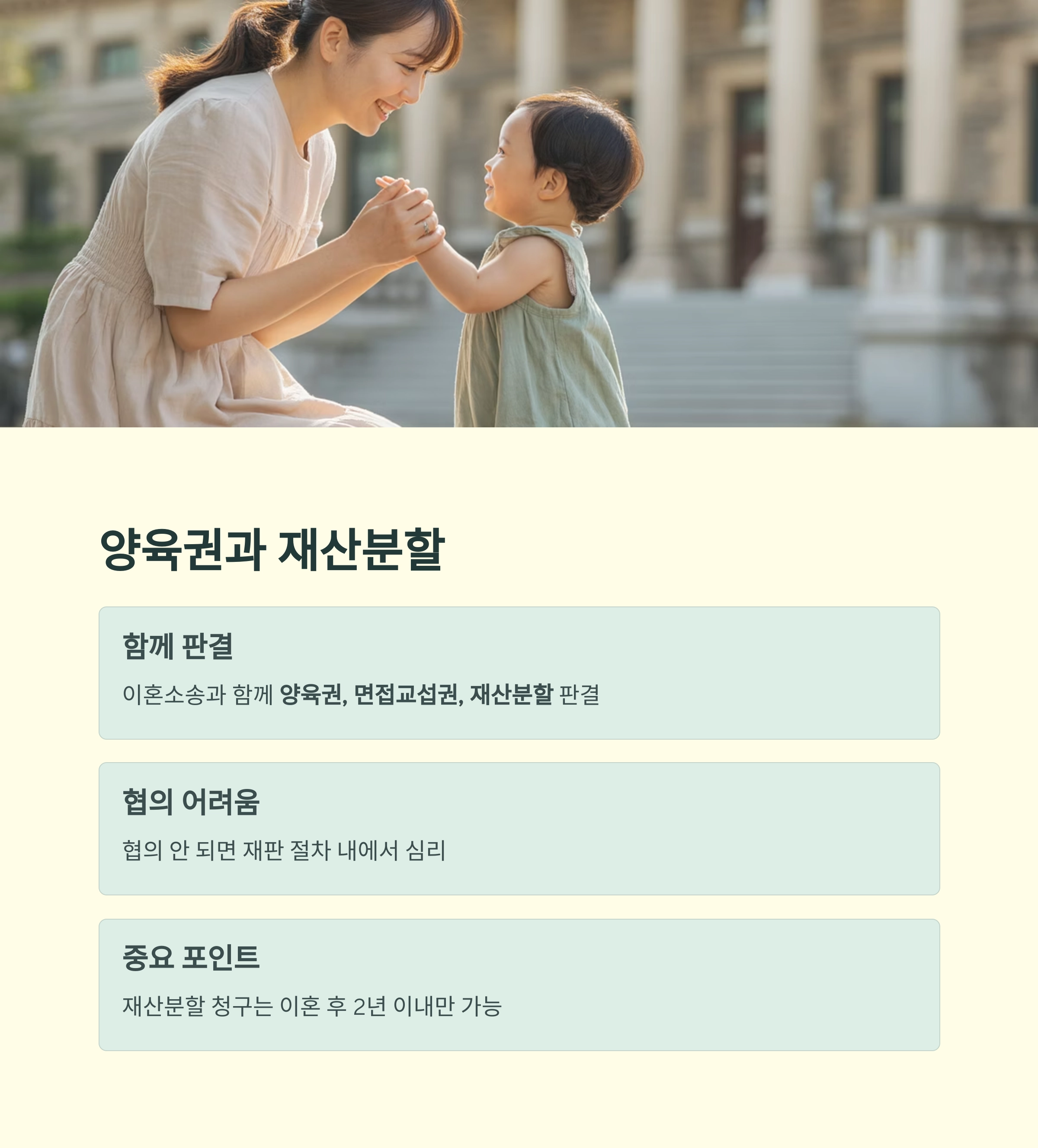 이혼소송과 함께 자녀의 양육권과 면접교섭권, 재산분할 문제도 법원에서 판결을 내리게 됩니다. 만약 협의가 어렵다면, 이 부분도 재판 절차 안에서 심리하게 됩니다. "재산분할 청구는 이혼 후 2년 이내만 가능하다"는 점은 법적으로 매우 중요한 포인트입니다.