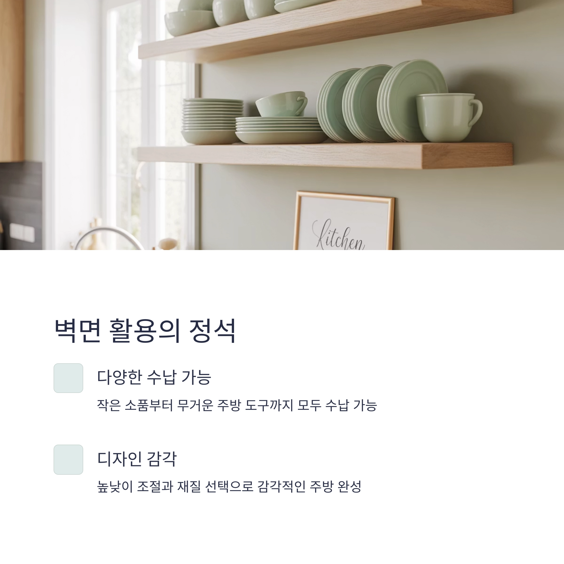 주방 벽면은 의외로 가장 활용도가 높은 공간입니다. 벽에 설치하는 걸이형 선반은 작은 소품부터 무거운 주방 도구까지 다양하게 수납할 수 있어 아주 유용합니다.